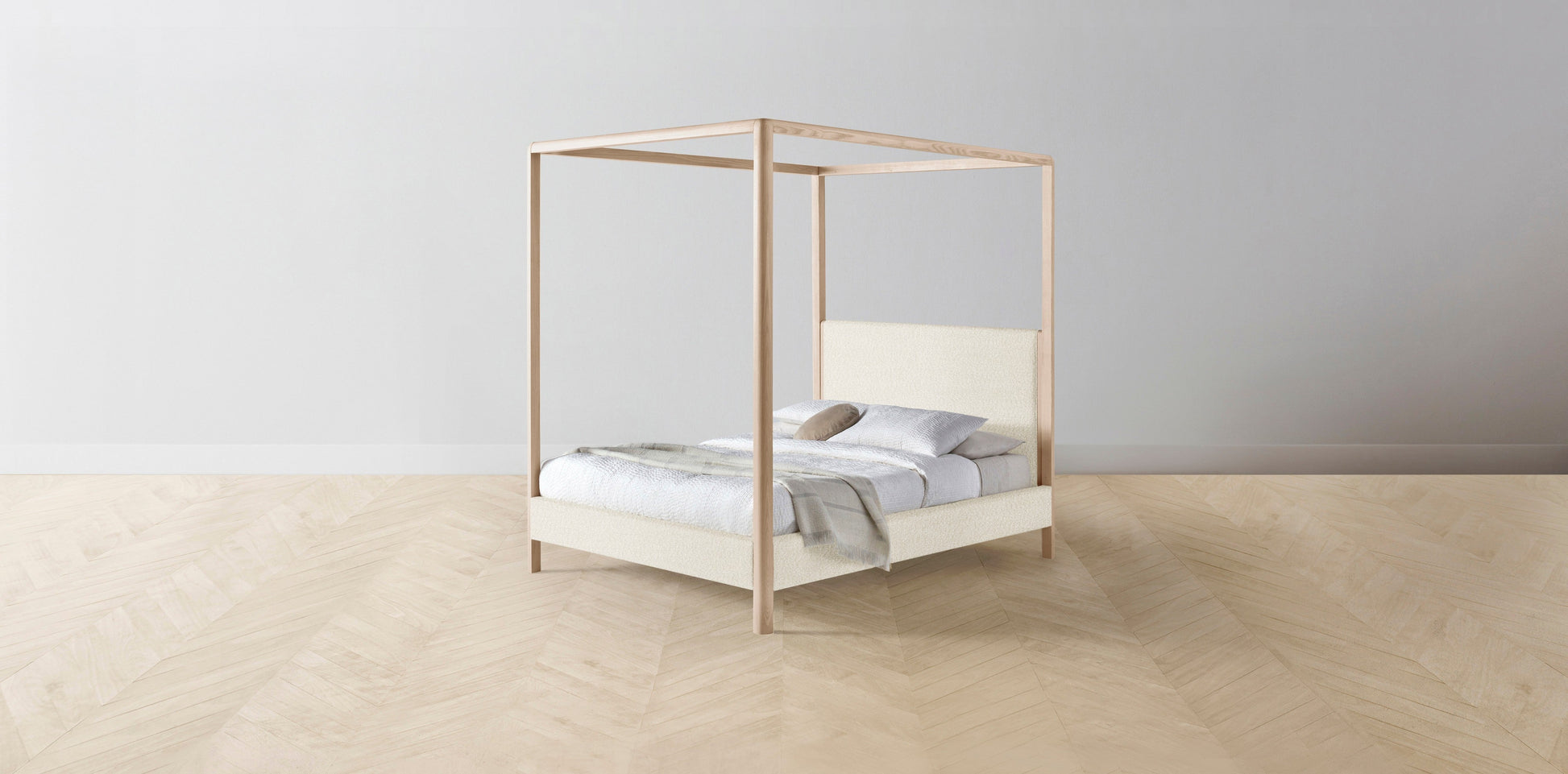 The Thompson - Italian Bouclé White Canopy Bed - 48" Headboard - Upholstered on reverse